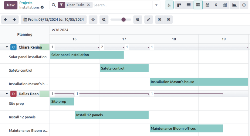 Pianificazione intelligente: usa la vista Gantt per organizzare i lavori dei tuoi team con la funzione drag & drop o lascia che Odoo li programmi per te.